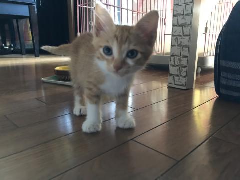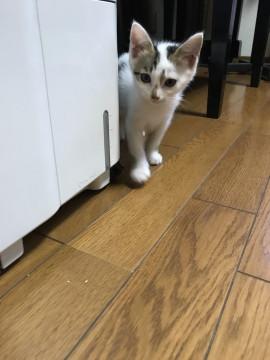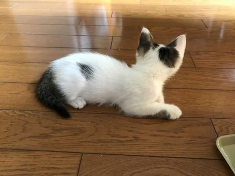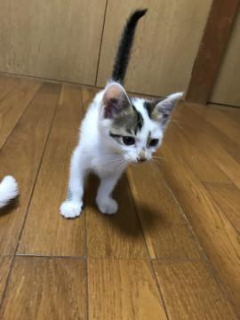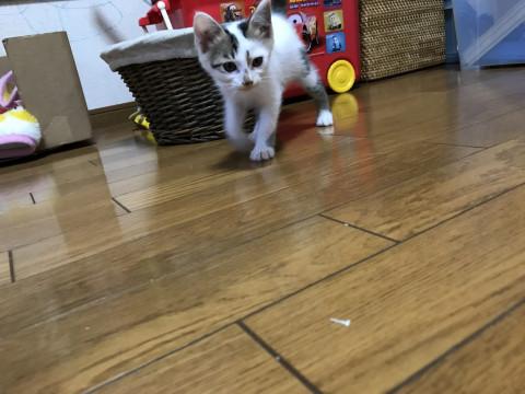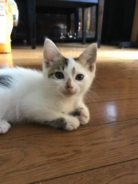 白ベースにまだらに模様が入ってるまだちゃんです(^^)保護初日は威嚇で触らせてもらえないくらいでしたが兄弟猫ちゃんもいたお陰か2日も経つとゴロゴロと甘えん坊になりました(^^)美形で兄弟思いのとーっても可愛い子です!我が家の先住猫ちゃんともじゃれあって遊べています!我が家の人間ちびが近づいても逃げないなんて保護初日では考えられないくらいです。笑