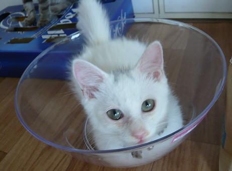 まっ白に頭の部分に模様有り尻尾はまっすぐ長いです。
