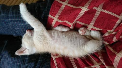 人懐っこく、ミルクをあげる保護主を覚え、膝に乗ってきて寝てくれます。