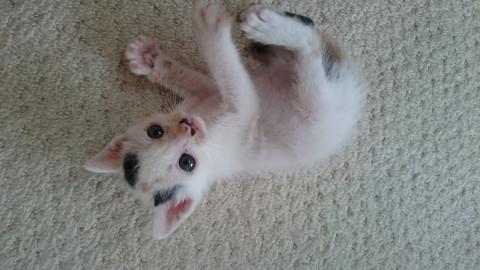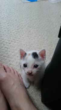 頭と尻尾が三毛で体が白い毛の女の子です。ちょっとおっとりした性格のようです。撫でられることが好きなようで、よくゴロゴロ喉を鳴らします。