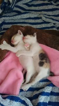 一緒に保護した子に比べると、ちょっとおっとりした性格のようです。姉妹仲良くじゃれて遊ぶようになりましたし、寝るときは二人でひっついて眠ります。