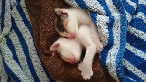 二人ともまだ1ヶ月にならないくらいの小さな姉妹で、もう1人の子はびしょ濡れで水を飲んでしまっていたので、2匹とも保護しました。