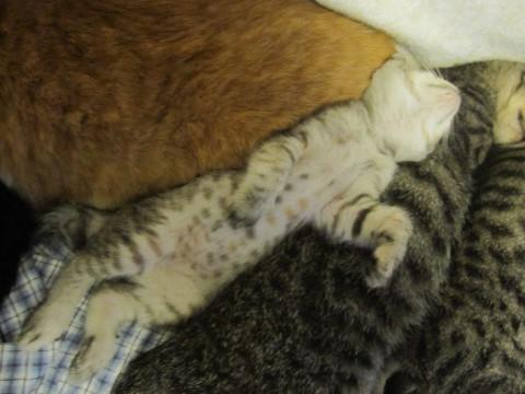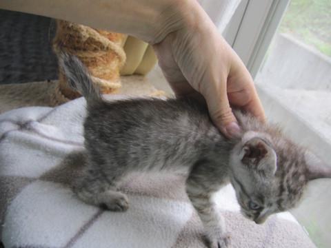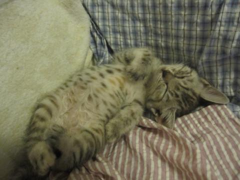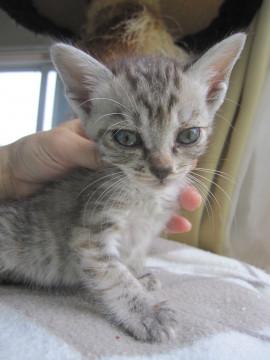 とってもかわいいさばとらのまーごちゃんです。背中などに部分的に茶色い毛が生えているので正確にはさびさば(?)かもしれません。丸顔で手足が短く、体つきも丸っこいのでマンチカンなどの洋猫が入っていると思います。姉妹の中では一番小柄ですが、とても元気でおてんばす。