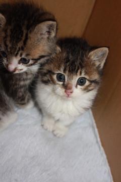 可愛いキジ白、おすかるちゃんです。コロッコロの体つきがとってもキュート。保護初日はふーふー言っていましたが、1日経って人懐こくなりました。あまり鳴きませんが活発に遊びます。