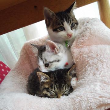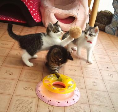 勝気で活発な女の子です。おもちゃにじゃれついては跳び回り、兄弟と戯れていつも元気で楽しそうです。遊び疲れたら、兄弟いっしょに折り重なって爆睡します。