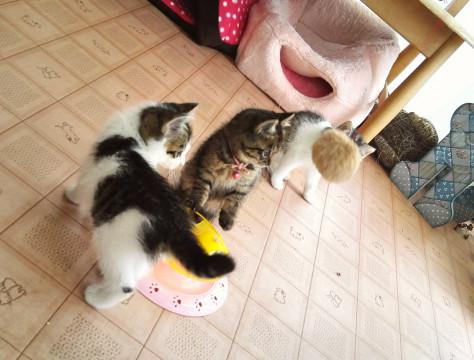 ある民家の庭で、おじいさんからフードをもらっていた野良猫のお母さんが、避妊手術予定の前日に三匹の赤ちゃんを産んでしまいました。