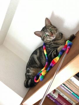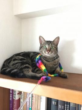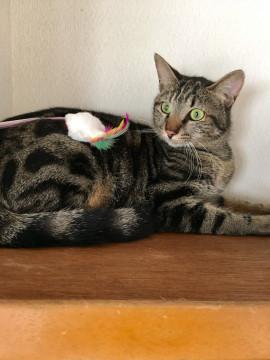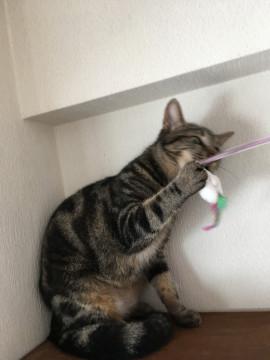 初めは警戒心が強いと思いますが、慣れてきたらオモチャ大好きな遊びたい盛りの女の子。他の保護猫とも仲良く過ごせています。