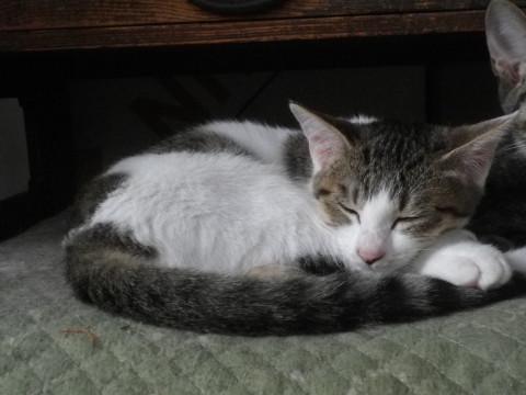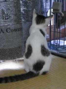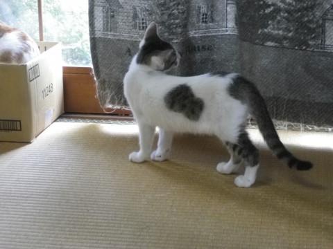 全体的に白で頭の上と尻尾がキジトラ(黄色・茶色が薄くサバトラに近い)。胴体には大きく丸状にキジトラ模様が数箇所入ります。