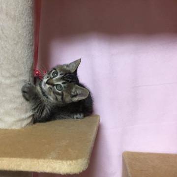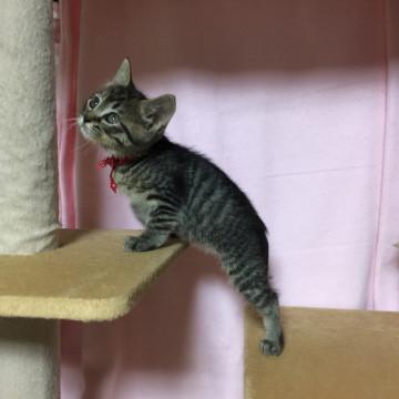 子猫らしくとても元気です。足が短くてチョコチョコと走っています。とても甘えん坊です。成猫とも友好的に過ごしています。