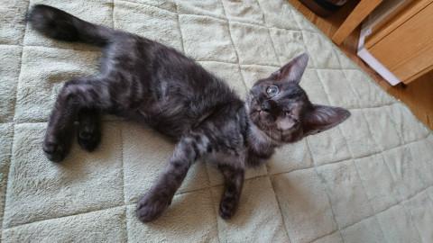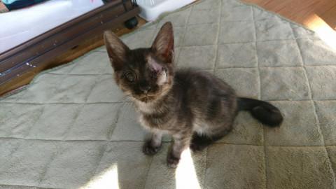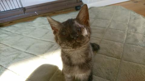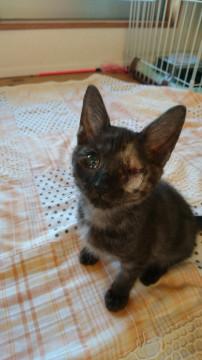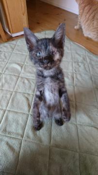 ※猫風邪の影響で、片眼が保護当初は飛び出していました。点眼.投薬で、だいぶよくなりましたが、失明していましたので、今後の猫生を考えて、片眼を摘出しています。特に生活に支障ありません。