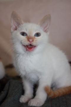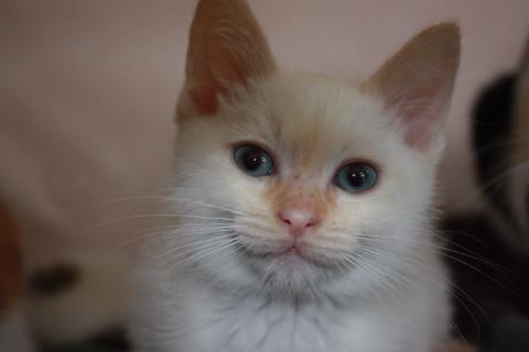 かわいいシャム系ミックス、あるばーと君です。ポイントは茶色で、ブルーアイです。ポイントは成長するにしたがってもっと濃くなるかもしれません。大変人懐こくごろすりさん、自己主張がはっきりしていて、とても活発です。