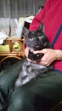 【毛色】 ブラックスモーク(濃いグレー・お腹のあたりは白っぽい毛が混ざっている)。しっぽは長くてまっすぐ