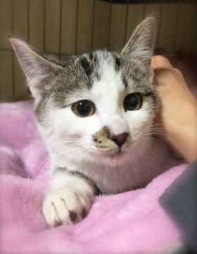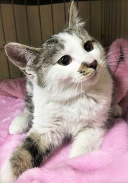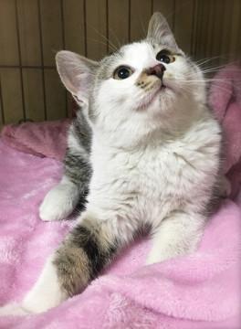 大きな瞳・きじ白・ほんの少し被毛が長く、背中の辺りはややグレーっぽい色をしています。