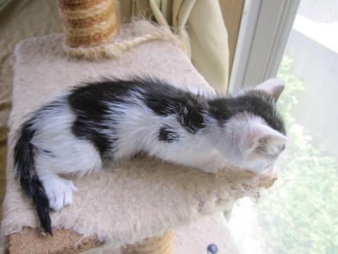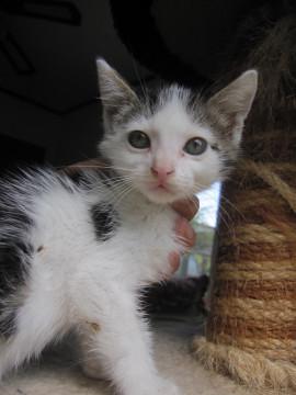 かわいいキジ白、いわのびっちくん、縞の部分がアメショっぽいがらです。今はやりの丸顔ではなく、しゅっとした、日本猫っぽいザ・和顔です。ちょとビビリさんで最初は人見知りしますが、人懐こく他の猫ちゃんにもフレンドリーです。また、とても活発で、一人でも、他の猫ちゃんとも楽しく遊びます。また、甘えん坊な部分もあり他の猫ちゃんのお乳をまだ吸っています。