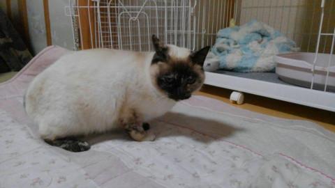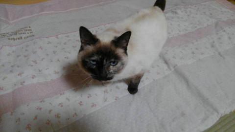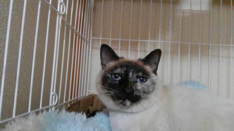 モモンはシャム風の雑種で、ブルーの瞳がきれいです。しっぽはカギですが、ふわふわです。
