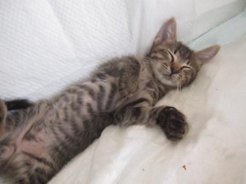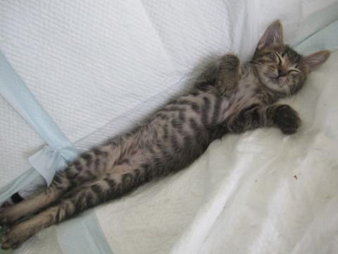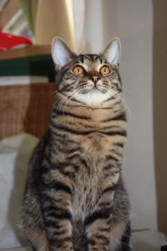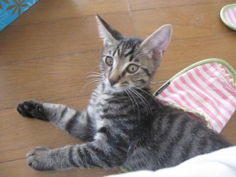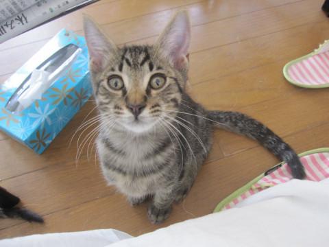 かわいいキジトラたっち君。ミルクから育てているので大変人懐こく、また活発で食欲旺盛です。他の猫ちゃんにもフレンドリー。人見知りもなく、お客さんのお膝に一番に乗ってくるお膝大好きの甘えん坊、朝はゴロゴロ上機嫌で起こしに来てくれます。また、毛が大変柔らかくベルベットのような手触りで、抱き心地も抜群です。