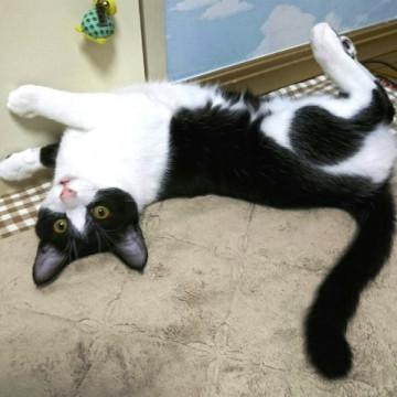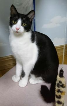 【毛色】 黒白ハチワレ。しっぽは黒く、長くてまっすぐ