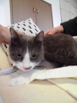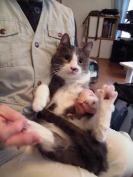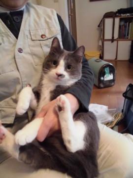 可愛い灰白のけん君、ちょびひげと手袋靴下がチャームポイント、ぬいぐるみのような可愛さです。保護主様の飼い猫ちゃんにが受け入れてくれないため、この寒さの中半屋外の小屋の中で生活しています。人に甘えることができなかったので、あまあまとまではいきませんが、保護主様には大変慣れていて、抱っこもさせてくれますし、兄弟の中では一番人懐こいです。新しい環境では少し時間をかけて慣れさせてやっていただきたいです。先に里親様が決まった兄弟たちは、時間のかかった子もいますが、みんな甘えん坊になりました。