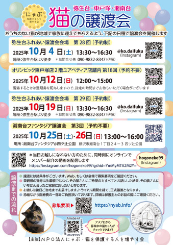 • 猫ちゃんの譲渡会を開催いたします。 1ヶ月位からの猫さん30匹位 大人猫さんも参加です。 月 日  2025年 10月 12日 日曜日 時 間  12時30分~15時30分まで 場所   神奈川県横浜市保土ケ谷区川島町360-6       川島第三町内会館(川島地域ケアプラザ裏側) 車    保土ケ谷バイパス新桜ヶ丘インターから8分       近隣のコインパーキングにお願いいたします。      (手前にある川島地域ケアプラザの駐車場には停めないでください) 電車   相鉄線 上星川駅より徒歩10分       相鉄線 西谷駅より徒歩15分 ★里親希望さまへお願い★ 必ず予約をしてからおいでください。 各回 30分 3~4組様  おいでになる方全員の氏名住所を記入をお願いいたします。 譲渡条件があります。お問い合わせください。 ご確認の上、ご応募ください。 猫の譲渡について http://nyankorotai.blog.fc2.com/blog-category-5.html 上記の譲渡条件をコピーペーストして下記アドレスへ送ってください。 追ってご連絡いたします。 お電話にても受付いたします。 下記の譲渡条件を送ってくださっても大丈夫です。 ◆ご応募時に下記事項をお知らせください◆ 1.お名前、簡単な住所 2.先住動物の有無(ワクチン 不妊手術の有無等)と選んだ理由 3.家族構成(家族全員の年齢 関係 お仕事等) 4.住宅環境(一戸建て 分譲マンション 一戸建て賃貸 賃貸マンションペット可) 5.留守番の時間 6.下記の①~⑨までの同意 ◆応募者様へのお願い◆ ①一生涯、家族の一員としてくださる事(猫は20年生きます)   ②完全室内飼いでお願いします。  (脱走防止対策をお願いします。ケージ 脱走防止扉 玄関窓等) ③不妊手術及び毎年のワクチン接種など健康管理   (不妊手術済のご連絡は必須) ④家族全員の同意があること    ⑤ペット可住宅にお住まいであること。  (ペット不可にお住まいの方には譲渡できません) ⑥身分証明の提示及び誓約書を記入していただきます。 ⑦譲渡後の近況報告をしていただける方 ⑧譲渡費用等をご負担できる方  (その他の治療費は血液検査) ⑨ほとんどの猫さんがお外から保護した子です。  その辺の事をご理解していただける方 猫が小さい場合はお留守番の短い家を希望します。 ケージのご用意をお願いいたします。 申し訳ありませんが先住動物さんが4匹以上のご家庭はお断りさせていただいております。 無職 学生 未成年の方からの申込は受け付けておりません。 ご家族に未就学児のいるお家及び高齢者の方は要相談 2匹一緒を優先させていただきます。 双方の条件が合った場合は譲渡会又は保護先にお見合にきていだだき成立後に自宅室内へお届けいたします。 この時期なので近くに方を優先させていただく事もあります。 ご予約お待ちしております。 にゃんころ隊 http://nyankorotai.blog.fc2.com 担当 北澤(にゃんころ隊) chieminn4057@icloud.com
