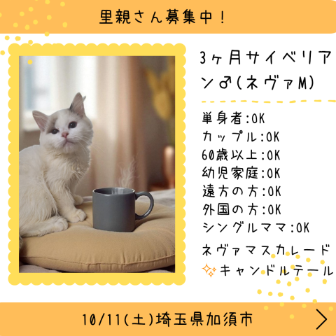 • フェアリーたまは純血猫ちゃん専門で里親募集をしている非営利型一般社団法人です。 フェアリーたまのお見合いイベント♪(譲渡会) 様々な事情で販売されることがなかった純血お見合い猫(子ねこ)・卒業猫(成猫)32頭以上が運命の出会いを待っています(⋈◍>◡<◍)。✧♡ 日時・・・10/11(土)13:00~ 会場・・・埼玉県加須市譲渡型型ふれあい施設フェアリーるーむ 里親希望のご家族様はフェアリーたまのホームページを確認し、活動内容をご理解の上、お見合いに参加申込お願いします。 フェアリーたまHP→『 https://fairytama222.wixsite.com/website-3』 スケジュール 13:00~13:25  1回目マッチングタイム 13:30~13:55  2回目マッチングタイム 14:00~14:25  3回目マッチングタイム 15:00頃     里親さま発表 15;30~17:00  譲渡説明・引渡 ●10/6現在 参加参加予定ねこちゃん(32頭以上) お見合い猫(子ねこ) ①5ヶ月短足シュガーフォールド♀ブルータビー ②5ヶ月短足マンチカン♂ブラウンタビー ③4ヶ月足長ミヌエット♂シルバータビー ④6ヶ月足長マンチカン♂ブルータビー&ホワイト ⑤6ヶ月アメリカンショートヘア♂シルバータビー ⑥4ヶ月サイベリアン♂カメオ&ホワイト ⑦4ヶ月ネヴァマスカレード(サイベリアン)♂シールポイント&ホワイト ⑧4ヶ月ネヴァマスカレード(サイベリアン)♂ブルーポイント ⑨5ヶ月スコテッシュフォールド♂ブルータビー ⑩7ヶ月スコテッシュフォールド♂ブラウンタビー&ホワイト ⑪5ヶ月スコテッシュストレート♂カメオタビー&ホワイト ⑫5ヶ月スコテッシュストレート♂クリームタビー&ホワイト ⑬5ヶ月セルカークレックス♀レッドタビー&ホワイト ⑭4ヶ月ブリティッシュショートヘア♂ブルー ⑮4ヶ月ベンガル♂シールリンクスポイント ⑯4ヶ月メインクーン♂ブラウンタビー&ホワイト ⑰6ヶ月ラグドール♂レッドポイント ⑱5ヶ月ラグドール♂ブルーポイントバイカラー ⑲5ヶ月ラガマフィン♂レッドタビー ⑳5ヶ月ラガマフィン♂シルバータビー&ホワイト ㉛4ヶ月アメリカンカール♂ ㉜4ヶ月短足マンチカ♀ブルータビー&ホワイト ㉝4ヶ月短足シュガーフォールド♂クリームタビー 卒業ねこ(成猫) ㊶1歳足長ミヌエット♀クリームタビー ㊷1歳ラガマフィン♀ダイリュートキャリコ ㊸5歳ラパーマ♀ブルータビー&ホワイト ㊹1歳アメリカンカール♂ブルータビー ㊺1歳スコテッシュフォールド
