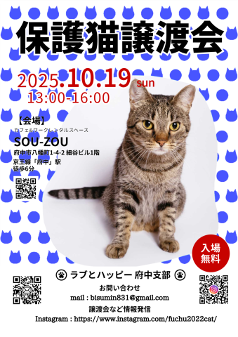 • ラブとハッピー府中【保護猫譲渡会】 たくさんの保護猫さんがあなたが里親になってくれるのを待っています! 「ラブとハッピー譲渡会」 ●日時:10月19日(日)13時00分~16時00分 ●会場:カフェ&レンタルスペース sou-zou 府中市八幡町1-4-2細谷ビル1階 http://sou-zou.jp ●最寄駅:京王線「府中」駅から徒歩6分 元外猫ですが預かりさん宅でスタッフが可愛がってお世話をしている猫たち、預かりさん宅で愛情いっぱいに家猫訓練をしている猫たちです。 猫さんを家族に迎えたい、一緒に暮らしたい方、ぜひ会場にお運びください。 スタッフ一同、ご来場をお待ちしております。 詳しい情報は下記にアップしてありますので、URLをクリックしてご覧ください。 ◆保護猫さんの動画かご覧になれます https://www.youtube.com/@fuchu2022cat ◆譲渡会の開催や保護猫さんの情報を発信しています https://www.instagram.com/fuchu2022cat/ ※譲渡会では選考があります。先着順ではありません。 ※里親様に決定した方には、後日、ご自宅までお届けいたします。 ※お一人暮らしの方、60歳以上の方には、ご希望時に後継人の方をお聞きします。 ※未就学児童のお子さんや、猫以外の動物の同居に関してもご相談ください。 ※お届け地域は、東京都、神奈川県、千葉県、埼玉県となります。なお、お届け先が府中市より片道40キロ以上かかる場合や有料駐車場へ駐車した場合には交通費・駐車場代を実費頂戴します。ご了承ください。 その他、詳しくは当日、会場スタッフにおたずねください。