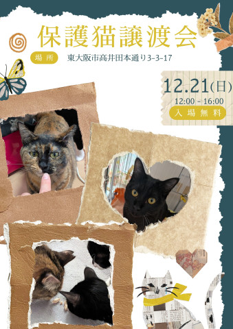 日時  2025年12月7日(日)       13:30~15:30 場所  天白生涯学習センター 名古屋市天白区天白町大字島田黒石4050 2階 第1集会室    予約不要 見学自由   主催  NPO法人Leeloo 待ちねこ譲渡会 HP    http://machineko.kilo.jp/ 里親さま募集中の猫たち  http://leeloo2015.livedoor.blog/ 当会が活動を行っている地域から保護をした猫たちが参加します。 健康診断、基本治療を済ませ、ワクチン接種を行った健康で元気な猫たちです。 当日、会場で猫のお渡しはいたしません。 家族として迎えたい子が決まりましたら、後日、ご自宅までお届けし、1週間ほどの トライアル(お試し飼育)をしていただきます。 * ペット可のお住まい、完全室内飼育、ご家族全員の同意、適切な時期の不妊去勢手術など  お願いしたい約束事項がございます。 * 次のねこたちにつなげていくために、里親さまに基本治療費のご負担をお願いしております。   基本治療費につきましてはホームページをご覧ください。