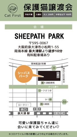 • 〈皆さまへのお願い〉 ※消毒のご協力お願い致します。 ※換気の為に会場の窓、入り口ドアを開放します。 その為猫の脱走防止対策として抱っこ、ケージのドアを開けての触れ合いは 原則禁止とします。 ※状況によりましては入場制限、時間制限を設ける場合がございます。 時間に余裕を持ってお越し下さい。 皆様にはご迷惑おかけ致しますが 何卒、ご理解ご協力のほど宜しくお願い致します。 ⚫︎入場料は大人200円 中学生以下100円です。 ⚫︎有料駐車場ございます。 ⚫︎シーパスパークへのお問い合わせはご遠慮願います。 ⚫︎最終受付は15:00です。 ⚫︎当日、猫は連れて帰れません。 ⚫︎里親会開催までに里親様が決まったり、 体調不良等の理由で当日参加できない場合がございます。 お問合せ先  catfirstsatooyakai@yahoo.co.jp ブログ  http://catfirst.blog.fc2.com