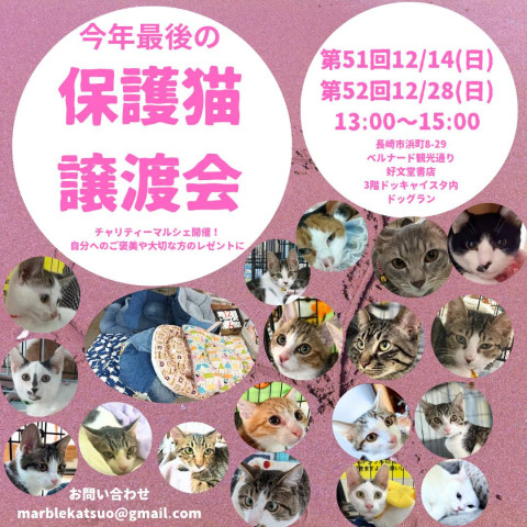 • ※子猫参加します。今年は12/20日が最終日です。天候不順の際は開催確認をしてからお越しください。 ●にゃんまるの会●ではアクセスの良い相模大野駅北口デッキ【イベントスペース】で 週末の午後2時から4時まで、保護猫の譲渡会を開催しています。 【イベントスペース】は相模大野駅・改札から1分。北口デッキに出てすぐの所です。 どうぞ新しい家族を待っている保護猫たちに会いに来てください。 ※写真を載せている猫に会ってみたい方は事前にご応募ください。 ※雨天、強風の場合などは開催できないこともございますため、天候不順の時はお越しになる前に 開催確認のお電話をしてくださるようにお願いしています。 【開催確認専用☎080-1194-0862 開催日の午前11時~午後1時くらいまで】 ●譲渡にはいくつか条件がございますので、お話がまとまらない場合もございます。 その場合はどうぞご容赦ください。 【譲渡の基本の条件】は ①ペット可のお住まいであること ②ご家族全員の賛成があること ③ご家族に猫アレルギーの方がいないこと ④終生飼養をお約束してくださること ⑤完全室内飼いと脱走防止ができること ⑥子猫の場合は適切な時期に避妊・去勢手術をすること などがあります。 ※その他の詳細はご応募の際にお話ししますが、猫とのマッチングなどさまざまな事を考慮して、 条件に合った方でもお話がまとまらない場合もございます。 その場合はどうぞご了承、ご容赦ください。 ●入場無料・予約不要です。ご来場をお待ちしています。 ●会場では保護猫のための支援物資(猫フードやおやつ、ペットシーツ)や募金などのご支援を 受け付けています。 ●サポート会員様を随時募集しています。年会費3000円で一年間会の活動を支援していただけます。 ***************** ●活動内容をブログで紹介しています。 https://ameblo.jp/pianoeo/ ●ホームページもご覧ください。 https://www.nyanmarunokai.com/ ●インスタグラム始めました。 https://www.instagram.com/nyanmarunokai/
