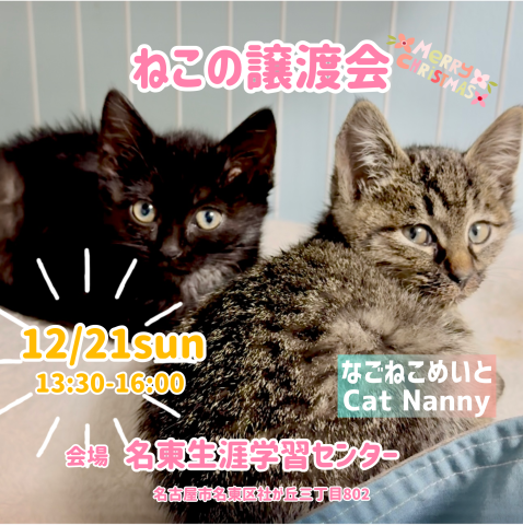 • 12月7日日曜日14:00〜16:00 中村区生涯学習センター 12月21日日曜日14:00〜16:00 名東区生涯学習センター 入場無料、予約不要 なごねこめいとです✨ 個人で保護猫活動をしているボランティアの集まりです! 🐾猫を家族に迎えたい方 🐾見学だけでも🆗です 🐾一緒に活動できるメンバー募集中 当日時間内にお越しください🐱 注意事項 ·当日猫を連れて帰ることはできません ·譲渡条件は各保護主に準じます 𓃠終生責任を持って愛情を注いでくださる方の申し込みを希望しています どうぞよろしくお願いいたします!