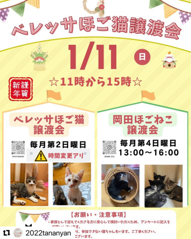 12月7日日曜日14:00〜16:00 中村区生涯学習センター 12月21日日曜日14:00〜16:00 名東区生涯学習センター 入場無料、予約不要 なごねこめいとです✨ 個人で保護猫活動をしているボランティアの集まりです! 🐾猫を家族に迎えたい方 🐾見学だけでも🆗です 🐾一緒に活動できるメンバー募集中 当日時間内にお越しください🐱 注意事項 ·当日猫を連れて帰ることはできません ·譲渡条件は各保護主に準じます 𓃠終生責任を持って愛情を注いでくださる方の申し込みを希望しています どうぞよろしくお願いいたします!