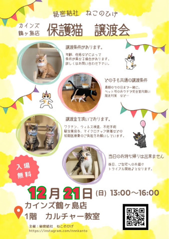 • 【秘密結社ねこのひげ♡保護猫譲渡会】 12/21(日) 13:00~16:00 埼玉県鶴ヶ島市三ツ木新町1-1-13 カインズ鶴ヶ島店1F カルチャー教室 にて保護猫譲渡会を開催します♪ 初期医療を済ませた仔猫たちの大祭! が続いています☆ 脳内はまだまだ仔猫やでー! なオトナ猫も元気いっぱい参加します♪ ずっとのご家族さまと 愛し愛されな 両想いになれますように♡ 家族にするなら保護猫だべ♪♪ 新しい家族と笑顔で暮らしたい♪ という方は是非会いにいらしてください♡ ご不明な点がございましたら Instagram @nnnkanto DMにてお問い合わせ下さい☆