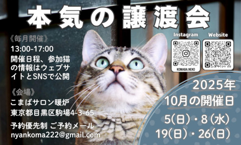 ずっとのお家家族を待つ猫さんが多数参加! 保護猫さんお迎えご検討の際はよろしくお願いいたします! Instagram @komaba.neko 本気の譲渡会11/16(日)13:00~17:00です。 1時間交代の予約優先制となります。 ご予約は nyankoma222@gmail.com まで。 お名前 人数 時間(①13:00~②14:00~③15:00~④16:00~) 会いたい猫がいれば名前 をお知らせください。 会場  東京都目黒区駒場4-3-65 レンタルスペースこまばサロン暖炉