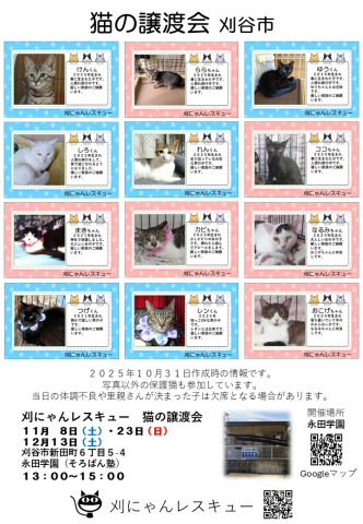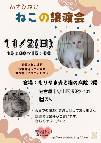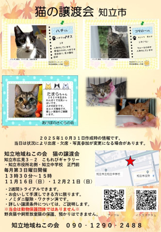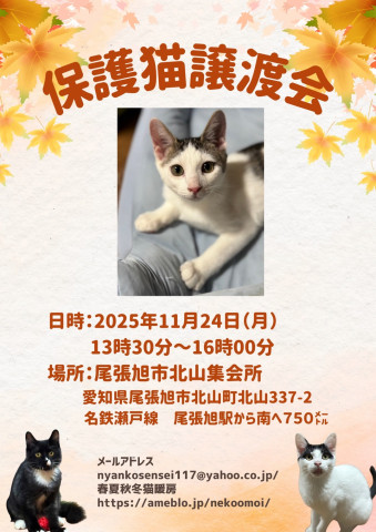 日時  2025年11月2日(日)       13:30~15:30 場所  天白生涯学習センター 名古屋市天白区天白町大字島田黒石4050 2階 第1集会室    予約不要 見学自由   主催  NPO法人Leeloo 待ちねこ譲渡会 HP    http://machineko.kilo.jp/ 里親さま募集中の猫たち  http://leeloo2015.livedoor.blog/ 当会が活動を行っている地域から保護をした猫たちが参加します。 健康診断、基本治療を済ませ、ワクチン接種を行った健康で元気な猫たちです。 当日、会場で猫のお渡しはいたしません。 家族として迎えたい子が決まりましたら、後日、ご自宅までお届けし、1週間ほどの トライアル(お試し飼育)をしていただきます。 * ペット可のお住まい、完全室内飼育、ご家族全員の同意、適切な時期の不妊去勢手術など  お願いしたい約束事項がございます。 * 次のねこたちにつなげていくために、里親さまに基本治療費のご負担をお願いしております。   基本治療費につきましてはホームページをご覧ください。
