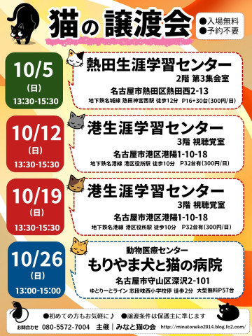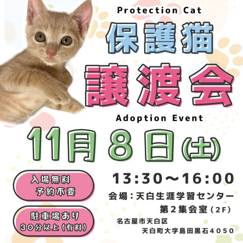 • 日時  2025年11月16日(日)       13:30~15:30 場所  天白生涯学習センター 名古屋市天白区天白町大字島田黒石4050 2階 第2集会室    予約不要 見学自由   主催  NPO法人Leeloo 待ちねこ譲渡会 HP    http://machineko.kilo.jp/ 里親さま募集中の猫たち  http://leeloo2015.livedoor.blog/ 当会が活動を行っている地域から保護をした猫たちが参加します。 健康診断、基本治療を済ませ、ワクチン接種を行った健康で元気な猫たちです。 当日、会場で猫のお渡しはいたしません。 家族として迎えたい子が決まりましたら、後日、ご自宅までお届けし、1週間ほどの トライアル(お試し飼育)をしていただきます。 * ペット可のお住まい、完全室内飼育、ご家族全員の同意、適切な時期の不妊去勢手術など  お願いしたい約束事項がございます。 * 次のねこたちにつなげていくために、里親さまに基本治療費のご負担をお願いしております。   基本治療費につきましてはホームページをご覧ください。
