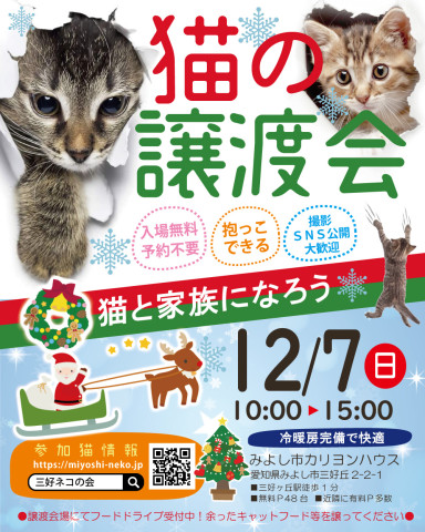 • 猫譲渡会!25匹くらいが参加予定! お家猫になるのは子猫!?中猫!?成猫!? 新しい出会いが幸福の招き猫になるかも? ※参加猫、匹数は開催1週間前にこちらでお知らせします。 【小さな猫の譲渡会★みよし市】 ■12月7日(日)10時~15時 ■みよし市カリヨンハウス(みよし市三好丘2-2-1) ※無料P48台、近隣に大型コインPあり <参加団体> NPO法人三好ネコの会 https://www.instagram.com/miyoshineko あいち東郷ねこの会 https://www.instagram.com/togoneko2 猫暖心 https://www.instagram.com/nekodangonet <ご来場前に> ・猫は先着や申入れの順番ではございません。 ・適正と条件を十分考慮させて頂き、トライアル先は抽選で決まります。 ・当選されたご家庭のみに当日電話連絡を差し上げます。 ・体調不良等で不参加になる猫もございます。 ●子猫譲渡手数料 ワクチン1回接種/1匹20,000円・2匹38,000円 ワクチン2回接種/1匹30,000円・2匹58,000円 ●成猫/オス30,000円・メス35,000円 ※成猫は不妊去勢済、ワクチン済です。 ※個人参加猫、他団体猫は上記手数料ではございません。 ■主催:NPO法人三好ネコの会 インスタ、Facebook、HPなどのSNSはこちら https://miyoshi-neko.jp/sns