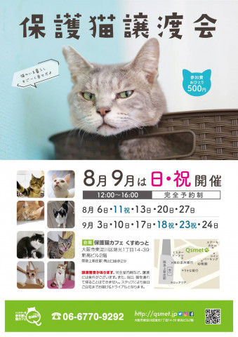+++感染予防の観点から、申し訳ありませんが完全ご予約制となります。+++ 12:00~ 12:30~ 13:00~ 13:30~ 14;00~ 14:30~ 15:00~ 15:30~ 16:00~ ご希望のお時間帯とご来店人数をお電話でご予約お願い致します 06-6770-9292 沢山の子達が終生のお家を探しています。 本気でお迎えをご検討されている里親候補様のみご参加お待ちしております。 子猫から大人猫まで50匹以上の子達が参加予定です。 可愛いみんにゃとお待ちしてます(*˘︶˘*).。.:*♡ 里親様に届きますように… くすめっとの里親譲渡会は、一般的な譲渡会と異なりケージの中の子達を見て頂く形ではありません。 店内を走り回る子猫たち、ゆっくりキャットタワーやキャットウォークで寛ぐ大人猫たちと触れ合って頂き店内で普段生活をしているありのままの姿を見て頂けます。 ※里親譲渡会のみ参加の子猫たちはゲージでの参加になります。 ・譲渡会参加の里親候補様は、お1人様500円の参加費をお願い致します。 ・子猫さんは、ご高齢のご家庭、お留守番の長いご家庭へ申し訳ありませんが託す事が出来ません。 ・当日猫を連れて帰る事は出来ません。(後日お届けさせて頂きます。) ・大切な命を託しますので譲渡条件、審査があります。 ・子猫さんのお届けは、車で1時間以内とさせて頂いてます。 ・玄関先での受け渡しはお断りしております。必ずその子が生活させて頂くお部屋を拝見させていただいております。 ※里親ご希望の方は、里親候補様へを必ず一読お願い致します 里親候補様へ http://ruu22.blog.fc2.com/blog-entry-4.html 里親譲渡会の詳しいご説明は、こちらをご覧ください http://ruu22.blog.fc2.com/blog-entry-1751.html ご参加の際は、必ずマスク、靴下の着用をお願い致します。 過密状態を作らない為に完全ご予約制となります。 ※ 里親譲渡会当日は、ネット環境に入れない可能性がありますのでお電話でお願い致します。 info★qsmet.jp  ← ★印を@に変えて下さい。 06-6770-9292 来店時間と来店人数をお知らせください。 ※沢山の里親候補様にご来店いただきたいので申し訳ありませんが1家族3名様までのご来店でお願い致します。 開催時間にご参加が難しい里親候補様は、お問い合わせお願い致します。 通常営業日にお見合い希望の里親候補様は、里親譲渡会と同じ料金をお願いしております。 必ず前日までにご予約お願い致します。 ※過密状態にならないようにご参加いただける里親候補様にも限りがございます。 その為、申し訳ありませんがお迎えいただけるお気持ちがない方のご予約は、他の里親候補様のご迷惑になりますのでお迎えいただけるお気持ちがある方のみご予約お願い致します