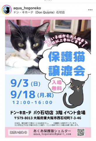 ❤️松猫・保護ねこの譲渡会 ( 毎月第2土曜日) 12月 9日 (土) 13時~16時 ?松猫シェルターの子たちと メンバー宅や個人宅で保護されている、人馴れ抜群の子たちが集まります! ?手作り小物、 キャリーケースカバー、捕獲器カバーの販売しております。 ?キャットフードドライブにご協力下さい❗(賞味期限内、未開封でお願い致します) ?お天気の時はミニフリマやります! ?野良猫相談、飼い猫相談、受け付けています。 【 譲渡には条件があります 】 各保護主さんに、ご確認ください。 松原市天美南5-9-4 カフェKiico セーブザアニマルズ譲渡センター ?近鉄南大阪線河内天美駅下車、徒歩3分 ?お車の方は近くのにコインパーキングにお願いします。 *猫は当日連れて帰る事は出来ません。 *マスク着用、消毒にご協力ください。 お問い合わせ matsubaraneko99@gmail.com