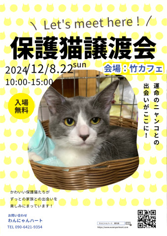 • 新型コロナウイルスの感染拡大により、譲渡会は以下の様な条件で開催したいと思います 【譲渡会見学希望者へのお願い】 *希望時間予約(1グループ30分) *氏名・住所・連絡先記載 *マスク着用・アルコール消毒 上記を了承の上、ご来場ください 【予約方法】 予約なしでも参加頂けますが、予約優先です。 お名前、お電話番号、希望時間(30分刻み) 《希望時間、10時~15時までの30分間》 わんにゃんハート09064219354まで、お電話かショートメール(電話が通じない場合)にてご予約ください 【譲渡会】 *成猫と仔猫がたくさん参加します。 *譲渡には「完全室内飼育」「避妊去勢手術の実施」などの条件があります。 *里親希望の方はアンケートにご記入をお願いします *持ち物は住所の確認できるもの、キャリーケース、事務手数料2000円と費用等です。詳しくはお問い合わせください。 *猫の保護・引き取りはしておりません。ペット用品やフード、寄付、ボランティアは大歓迎です。 *皆さんのお越しをお待ちしています。