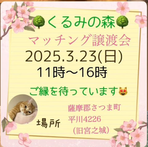 • 11月16日はかごしま健康の森公園ファミリー広場での譲渡会になります‼️年に一回限りの開催場所となっておりますので、ぜひご参加ください! 屋外での開催なので実際に猫は居ますが、抱っこはNGです。ご了承上、ご参加ください。 実際に触れ合いたい場合は次の30日に谷山市民会館開催の譲渡会にお越しくださいますよう、お願い致します。 【予約方法】 予約なしでも参加頂けますが、予約優先です。 お名前、お電話番号、希望時間(30分刻み) 《希望時間、10時~15時までの30分間》 わんにゃんハート09064219354まで、お電話かショートメール(電話が通じない場合)にてご予約ください 【譲渡会】 *成猫と仔猫がたくさん参加します。 *譲渡には「完全室内飼育」「避妊去勢の実施」などの条件があります。 *里親希望の方はアンケートにご記入をお願いします *持ち物は住所の確認できるもの、キャリーケース、事務手数料2000円と費用等です。詳しくはお問い合わせください。 *猫の保護・引き取りはしておりません。ペット用品やフード、寄付、ボランティアは大歓迎です。 *皆さんのお越しをお待ちしています。