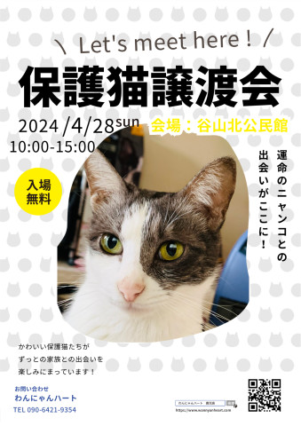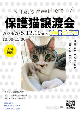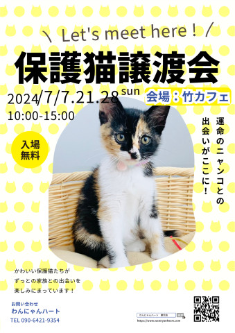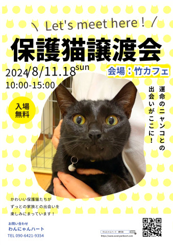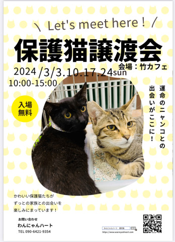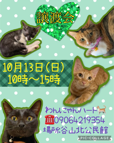 • 新型コロナウイルスの感染拡大により、譲渡会は以下の様な条件で開催したいと思います 【譲渡会見学希望者へのお願い】 *希望時間予約(1グループ30分) *氏名・住所・連絡先記載 *マスク着用・アルコール消毒 上記を了承の上、ご来場ください 【予約方法】 予約なしでも参加頂けますが、予約優先です。 お名前、お電話番号、希望時間(30分刻み) 《希望時間、10時~15時までの30分間》 わんにゃんハート09064219354まで、お電話かショートメール(電話が通じない場合)にてご予約ください 【譲渡会】 *成猫と仔猫がたくさん参加します。 *譲渡には「完全室内飼育」「避妊去勢手術の実施」などの条件があります。 *里親希望の方はアンケートにご記入をお願いします *持ち物は住所の確認できるもの、キャリーケース、事務手数料2000円と費用等です。詳しくはお問い合わせください。 *猫の保護・引き取りはしておりません。ペット用品やフード、寄付、ボランティアは大歓迎です。 *皆さんのお越しをお待ちしています。