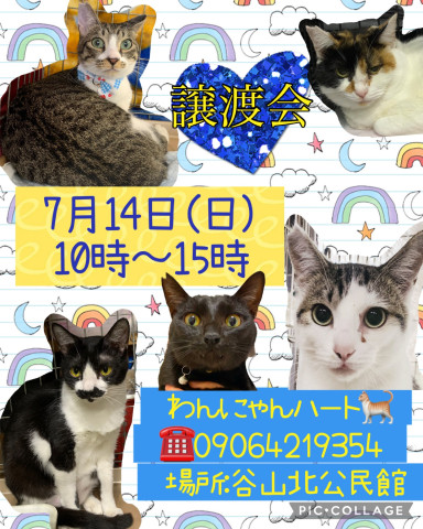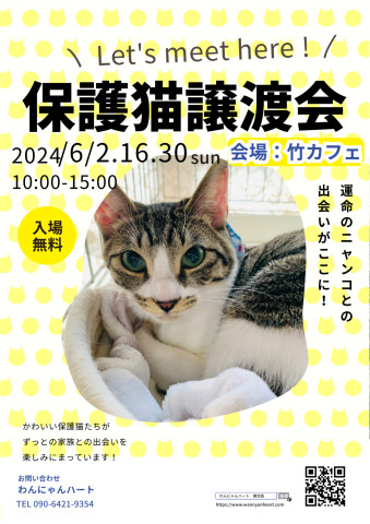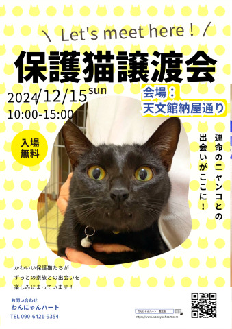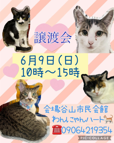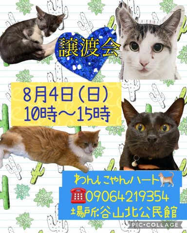 新型コロナウイルスの感染拡大により、譲渡会は以下の様な条件で開催したいと思います 【譲渡会見学希望者へのお願い】 *希望時間予約(1グループ30分) *氏名・住所・連絡先記載 *マスク着用・アルコール消毒 上記を了承の上、ご来場ください 【予約方法】 予約なしでも参加頂けますが、予約優先です。 お名前、お電話番号、希望時間(30分刻み) 《希望時間、10時~15時までの30分間》 わんにゃんハート09064219354まで、お電話かショートメール(電話が通じない場合)にてご予約ください 【譲渡会】 *成猫と仔猫がたくさん参加します。 *譲渡には「完全室内飼育」「避妊去勢の実施」などの条件があります。 *里親希望の方はアンケートにご記入をお願いします *持ち物は住所の確認できるもの、キャリーケース、事務手数料2000円と費用等です。詳しくはお問い合わせください。 *猫の保護・引き取りはしておりません。ペット用品やフード、寄付、ボランティアは大歓迎です。 *皆さんのお越しをお待ちしています。