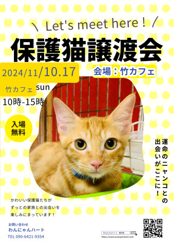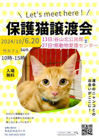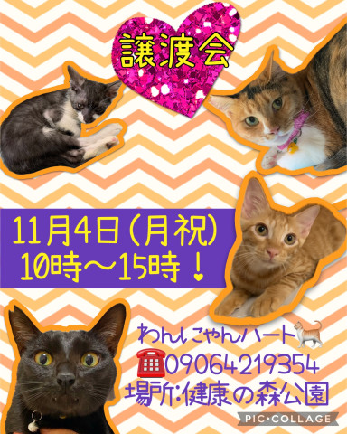 • 11月4日は健康の森公園ファミリー広場での譲渡会になります‼️年に一回限りの開催場所となっておりますので、ぜひご参加ください! 屋外での開催なので実際に猫は居ますが、抱っこはNGです。ご了承上、ご参加ください。 実際に触れ合いたい場合は次の11日に竹カフェ開催の譲渡会にお越しくださいますよう、お願い致します。 【譲渡会見学希望者へのお願い】 *希望時間予約(1グループ(家族2人)30分) 上記を了承の上、ご来場ください 【予約方法】 予約なしでも参加頂けますが、予約優先です。 お名前、お電話番号、希望時間(30分刻み) 《希望時間、10時~15時までの30分間》 わんにゃんハート09064219354まで、お電話かショートメール(電話が通じない場合)にてご予約ください 【譲渡会】 *成猫と仔猫がたくさん参加します。 *譲渡には「完全室内飼育」「避妊去勢の実施」などの条件があります。 *里親希望の方はアンケートにご記入をお願いします *持ち物は住所の確認できるもの、キャリーケース、事務手数料2000円と費用等です。詳しくはお問い合わせください。 *猫の保護・引き取りはしておりません。ペット用品やフード、寄付、ボランティアは大歓迎です。 *皆さんのお越しをお待ちしています。