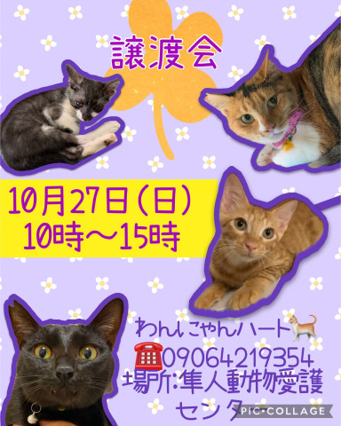 • ★10月27日は鹿児島県動物愛護センターでの譲渡会になります‼️年に一回限りの開催場所となっておりますので、ぜひご参加ください! 屋外での開催なので実際に猫は居ますが、抱っこはNGです。ご了承上、ご参加ください。 実際に触れ合いたい場合は次回開催の譲渡会にお越しくださいますよう、お願い致します。★ 【予約方法】 予約なしでも参加頂けますが、予約優先です。 お名前、お電話番号、希望時間(30分刻み) 《希望時間、10時~15時までの30分間》 わんにゃんハート09064219354まで、お電話かショートメール(電話が通じない場合)にてご予約ください 【譲渡会】 *成猫と仔猫がたくさん参加します。 *譲渡には「完全室内飼育」「避妊去勢の実施」などの条件があります。 *里親希望の方はアンケートにご記入をお願いします *持ち物は住所の確認できるもの、キャリーケース、事務手数料2000円と費用等です。詳しくはお問い合わせください。 *猫の保護・引き取りはしておりません。ペット用品やフード、寄付、ボランティアは大歓迎です。 *皆さんのお越しをお待ちしています。