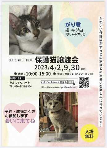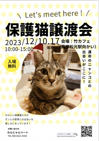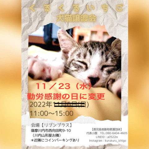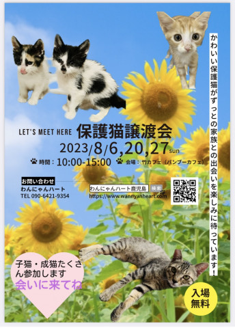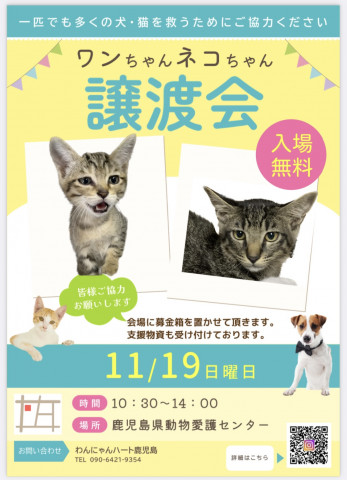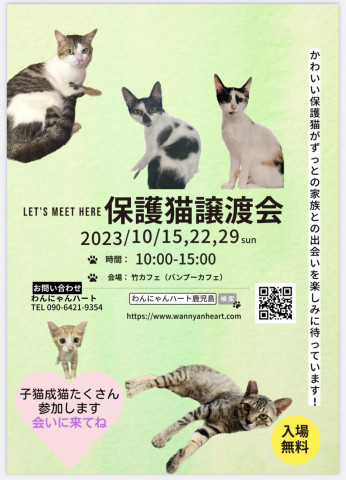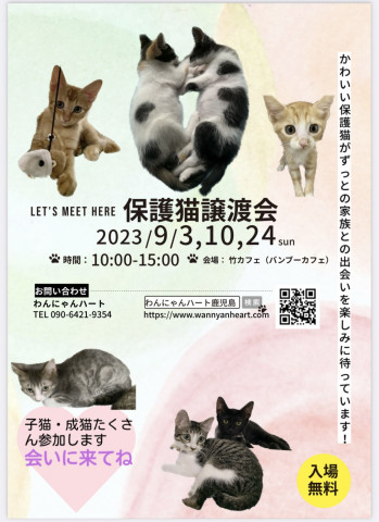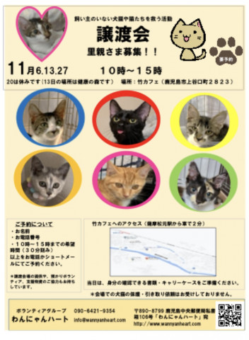 • ★11月19日は鹿児島県動物愛護センターでの譲渡会になります‼️年に一回限りの開催場所となっておりますので、ぜひご参加ください! 屋外での開催なので実際に猫は居ますが、抱っこはNGです。ご了承上、ご参加ください。 実際に触れ合いたい場合は次回開催の譲渡会にお越しくださいますよう、お願い致します。★ 新型コロナウイルスの感染拡大により、譲渡会は以下の様な条件で開催したいと思います 【譲渡会見学希望者へのお願い】 *希望時間予約(1グループ(家族2人)30分) *氏名・住所・連絡先記載 *マスク着用・アルコール消毒 *2週間以内に、県外への外出・県外の方との濃厚接触・感染が疑われる場所に行ってない事 上記を了承の上、ご来場ください 【予約方法】 予約なしでも参加頂けますが、予約優先です。 お名前、お電話番号、希望時間(30分刻み) 《希望時間、10時~15時までの30分間》 わんにゃんハート09064219354まで、お電話かショートメール(電話が通じない場合)にてご予約ください 【譲渡会】 *成猫と仔猫がたくさん参加します。 *譲渡には「完全室内飼育」「避妊去勢の実施」などの条件があります。 *里親希望の方はアンケートにご記入をお願いします *持ち物は住所の確認できるもの、キャリーケース、事務手数料2000円と費用等です。詳しくはお問い合わせください。 *猫の保護・引き取りはしておりません。ペット用品やフード、寄付、ボランティアは大歓迎です。 *皆さんのお越しをお待ちしています。