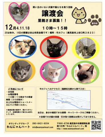 • 今回の会場は谷山市民会館です。 この会場を使用しての譲渡会は稀ですので、たくさんの方の来場をお待ちしています。 新型コロナウイルスの感染拡大により、譲渡会は以下の様な条件で開催したいと思います 【譲渡会見学希望者へのお願い】 *希望時間予約(1グループ(家族2人)30分) *氏名・住所・連絡先記載 *マスク着用・アルコール消毒 *2週間以内に、県外への外出・県外の方との濃厚接触・感染が疑われる場所に行ってない事 上記を了承の上、ご来場ください 【予約方法】 予約なしでも参加頂けますが、予約優先です。 お名前、お電話番号、希望時間(30分刻み) 《希望時間、10時~15時までの30分間》 わんにゃんハート09064219354まで、お電話かショートメール(電話が通じない場合)にてご予約ください 【譲渡会】 *成猫と仔猫がたくさん参加します。 *譲渡には「完全室内飼育」「避妊去勢の実施」などの条件があります。 *里親希望の方はアンケートにご記入をお願いします *持ち物は住所の確認できるもの、キャリーケース、事務手数料2000円と費用等です。詳しくはお問い合わせください。 *猫の保護・引き取りはしておりません。ペット用品やフード、寄付、ボランティアは大歓迎です。 *皆さんのお越しをお待ちしています。