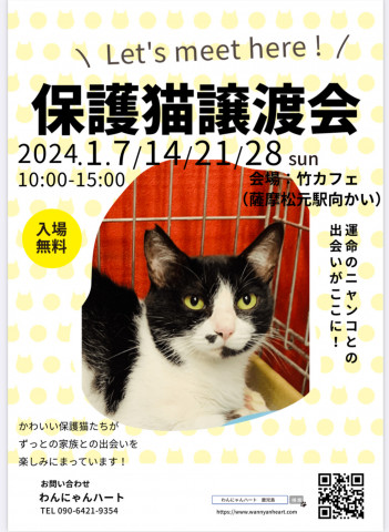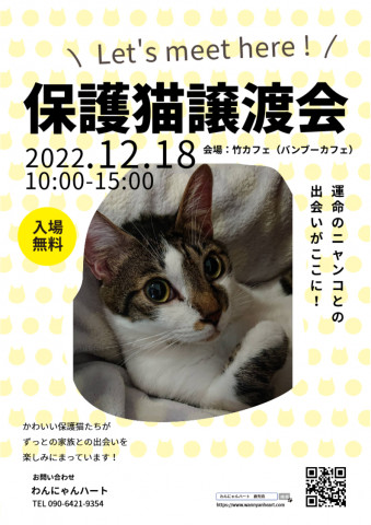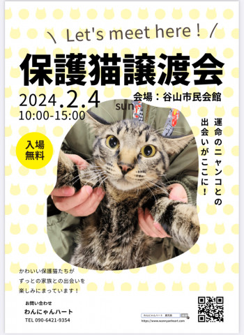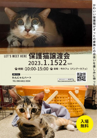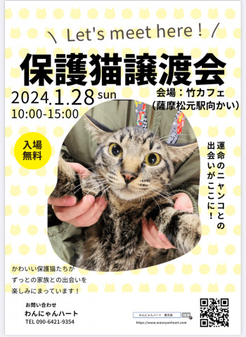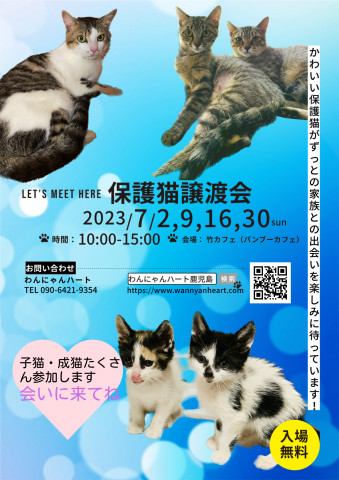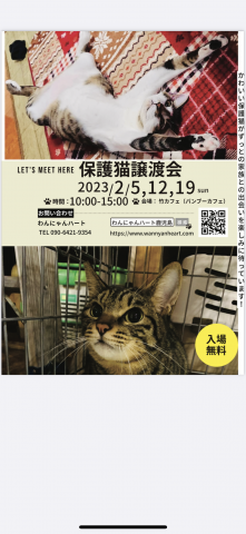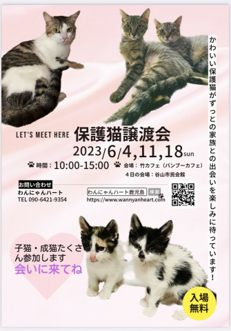 • 新型コロナウイルスの感染拡大により、譲渡会は以下の様な条件で開催したいと思います 【譲渡会見学希望者へのお願い】 *希望時間予約(1グループ(家族2人)30分) *氏名・住所・連絡先記載 *マスク着用・アルコール消毒 *2週間以内に、県外への外出・県外の方との濃厚接触・感染が疑われる場所に行ってない事 上記を了承の上、ご来場ください 【予約方法】 予約なしでも参加頂けますが、予約優先です。 お名前、お電話番号、希望時間(30分刻み) 《希望時間、10時~15時までの30分間》 わんにゃんハート09064219354まで、お電話かショートメール(電話が通じない場合)にてご予約ください 【譲渡会】 *成猫と仔猫がたくさん参加します。 *譲渡には「完全室内飼育」「避妊去勢の実施」などの条件があります。 *里親希望の方はアンケートにご記入をお願いします *持ち物は住所の確認できるもの、キャリーケース、事務手数料2000円と費用等です。詳しくはお問い合わせください。 *猫の保護・引き取りはしておりません。ペット用品やフード、寄付、ボランティアは大歓迎です。 *皆さんのお越しをお待ちしています。