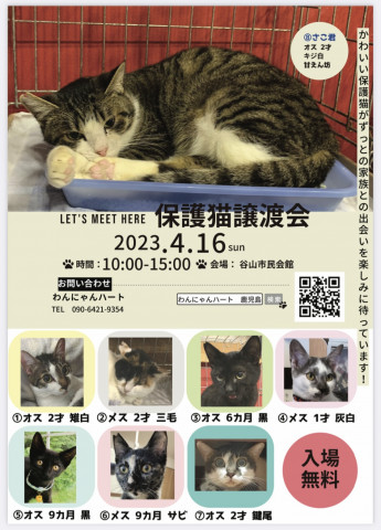 ♡♡肉球譲渡会&絵本読み聞かせ会♡♡ 11:00~12:00 絵本読み聞かせ 13:00~16:00 肉球譲渡会 いのちの大切さを学ぼう! ということでお子様向けに絵本読み聞かせを 行ないます! 事前予約不要です。 会場内には猫がいるのでアレルギーの方は ご注意ください。 *健康管理をされた猫で、ケージに入っています。 譲渡会については たくさんの子たちが参加予定となっています! 保護猫をお迎えしようと考えているご家族さま! ぜひ、お越しください! *無理ふれあい広場ではないので、 里親希望者のみ抱っこ可能とします。