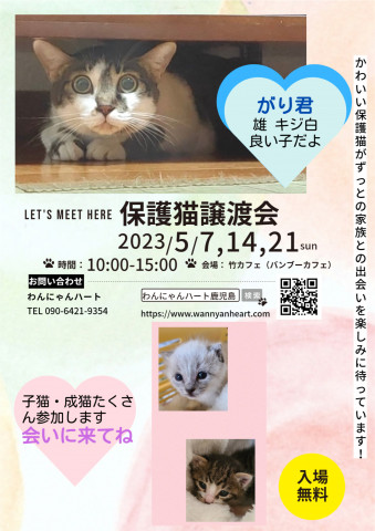 霧島市隼人町サン・あもりにて毎月 里親探しの会をしております。一般参加の方々も里親探しの為 保護した猫ちゃん達への出会いの場として提供いたします。沢山の猫ちゃん達が参加しますので是非とも会いに来てくださいニャン?