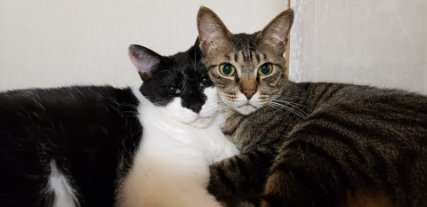 マスクをかぶったような黒白ぶち猫のポッポ。