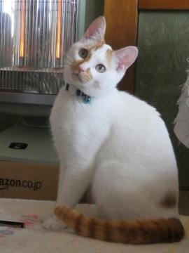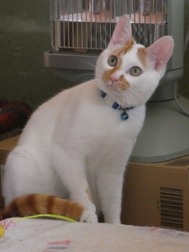 白が多い茶白の子です。ごはんは少しずつちょこちょこ食べるタイプ。そのせいか我が家のオス猫のなかではスリム体型です。(他の猫が大きすぎるのもアリ…)